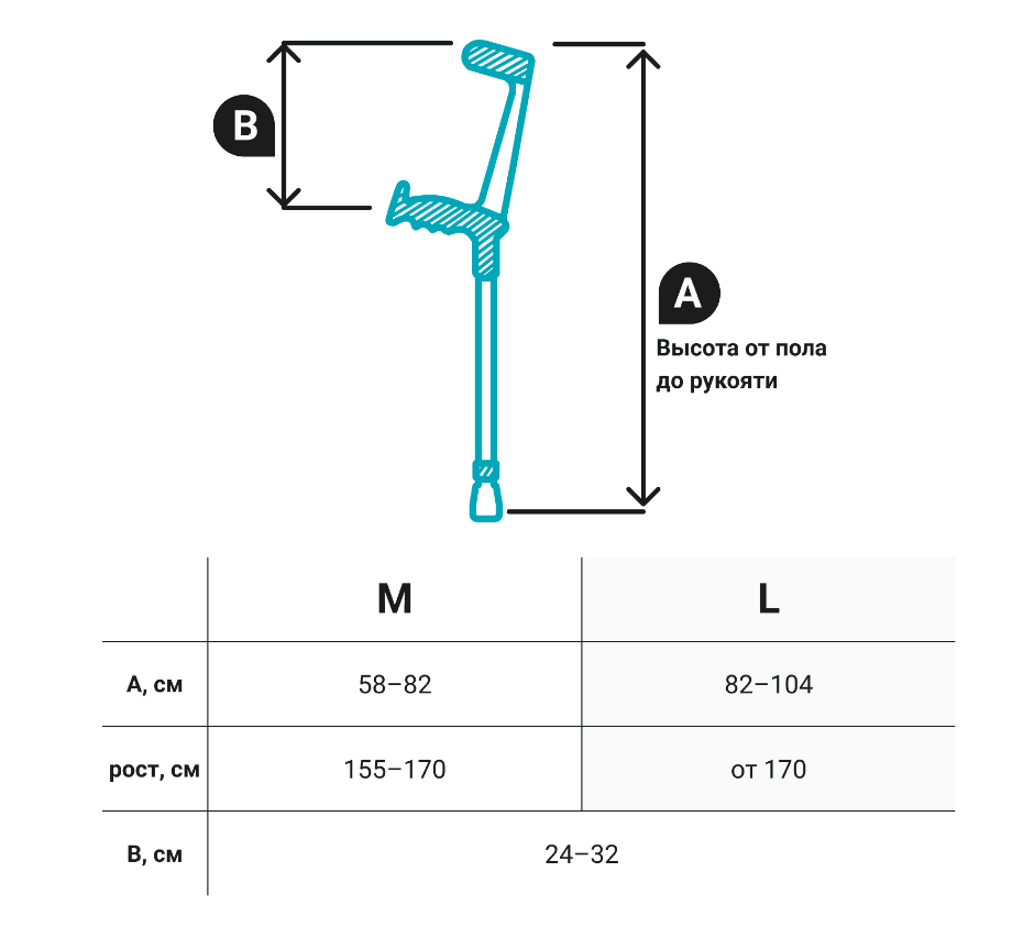 Высота от рукояти до опоры под локоть 24–32 см (размеры M и L).