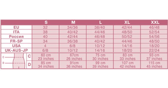 Подбор размера: необходимо измерить окружность груди и под грудью и воспользоваться таблицей размеров.
