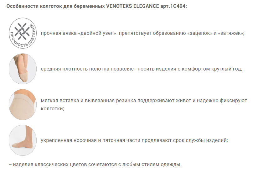 VENOTEKS ELEGANCE предотвращают усталость и тяжесть в ногах, снимают небольшие отёки и другие начальные проявления заболевания вен. Колготки рекомендованы для профилактики и при начальных стадиях поражения вен на уровне бедра, подколенной ямки голени и/или стопы у беременных женщин.