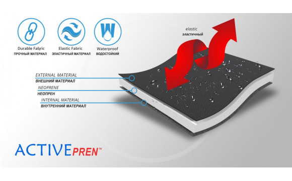 Изготовлен из ActivePren™ это трехслойный материал, состоящий из внешней эластичной ткани и внутреннего слоя из неопреновой пенки. Материал характеризуется мягкостью и высокой эластичностью