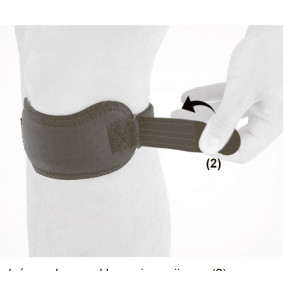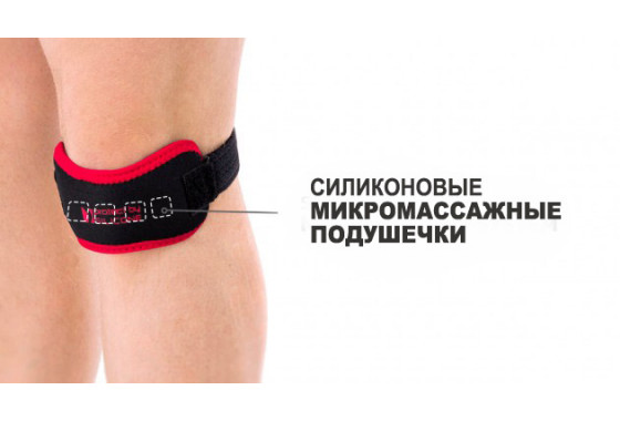 Изделие состоит из силиконовой пелоты, которая представляет собой небольшую подушечку и отвечает за разгрузку связок надколенника, а также эластичного ремешка со скобой из пластика, крепко фиксирующего ортез на ноге.