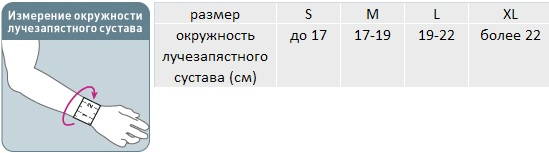Для правильного выбора подходящего размера лучезапястного ортеза Orlett WRS-202 необходимо сантиметровой лентой измерить окружность запястья и воспользоваться таблицей: