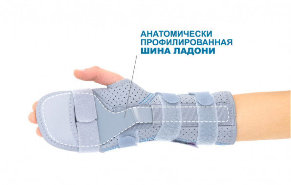 Ортез имеет ладонную шину анатомической формы, которая удерживает руку в нейтральном положении и предотвращает тыльное и ладонное сгибание. Шина обеспечивая нейтральное положение суставов для улучшения заживления после перелома или травмы. Ладонная часть шины фиксирует в правильном положении пальцы со второго по пятый. Ортез снабжен ремешком вокруг пястных костей, предотвращающем непроизвольное сгибание пальцев.