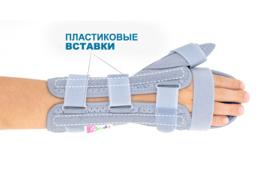 Детская шина на запястье AM-OSN-L-02 обеспечивает иммобилизацию и стабилизацию запястья, кисти и первого пальца кисти.