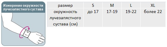 Для правильного выбора подходящего размера лучезапястного ортеза Orlett WRS-302 необходимо сантиметровой лентой измерить окружность лучезапястного сустава и воспользоваться таблицей:
