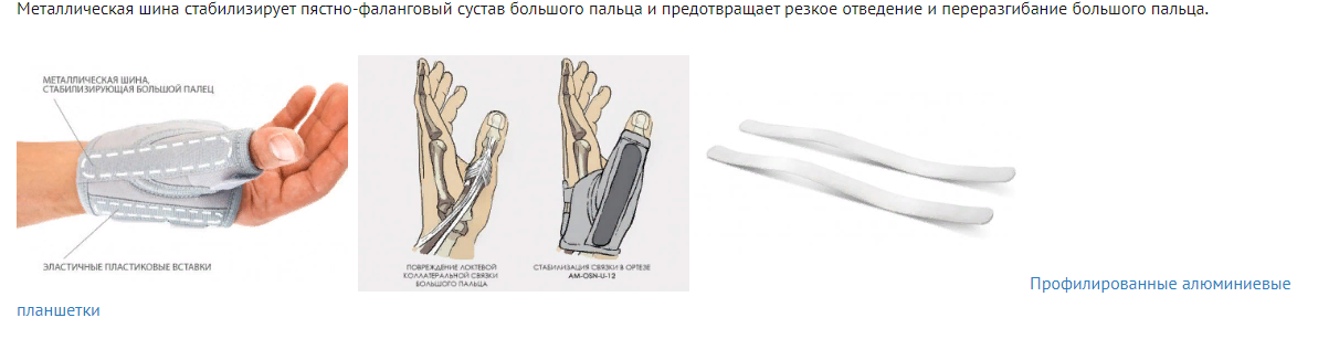 Металлическая шина стабилизирует пястно-фаланговый сустав большого пальца и предотвращает резкое отведение и переразгибание большого пальца.