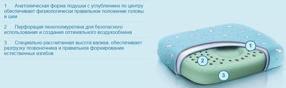 Способ применения: подушку размещают под голову так, чтобы шейный отдел позвоночника располагался на маленьком валике подушки, а голова – в углублении подушки